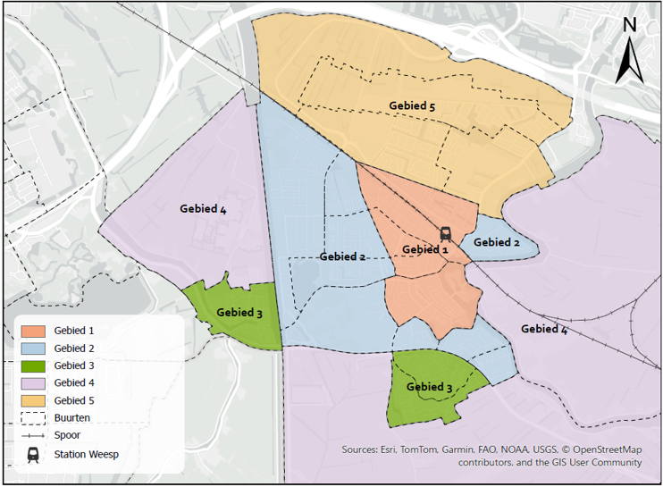 Op bovenstaande kaart zijn de 5 verschillende gebiedstypes in Weesp en Driemond te zien. De gebieden hebben de volgende kenmerken: