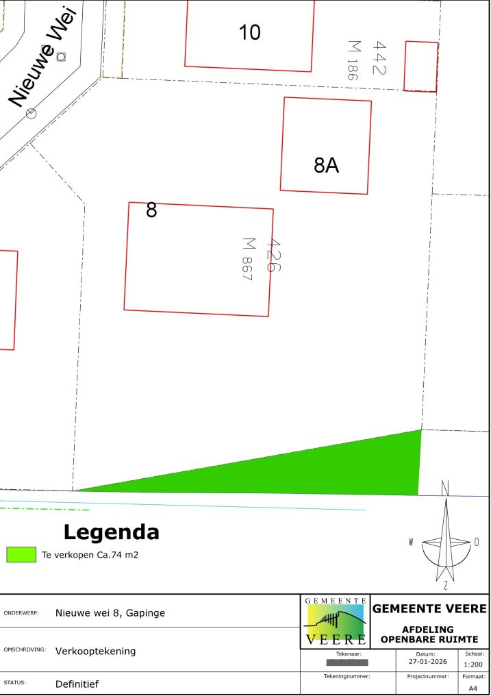 De gemeente Veere heeft het voornemen om een strook grond, gelegen nabij Nieuwe Wei 8 te Gapinge, kadastraal bekend gemeente Veere, sectie M nummer 439, ter grootte van ongeveer 74 m2, aan welk perceel door het kadaster voorlopige kadastrale grenzen en oppervlakten zijn toegekend, te verkopen en te leveren aan de aangrenzende perceelseigenaar.