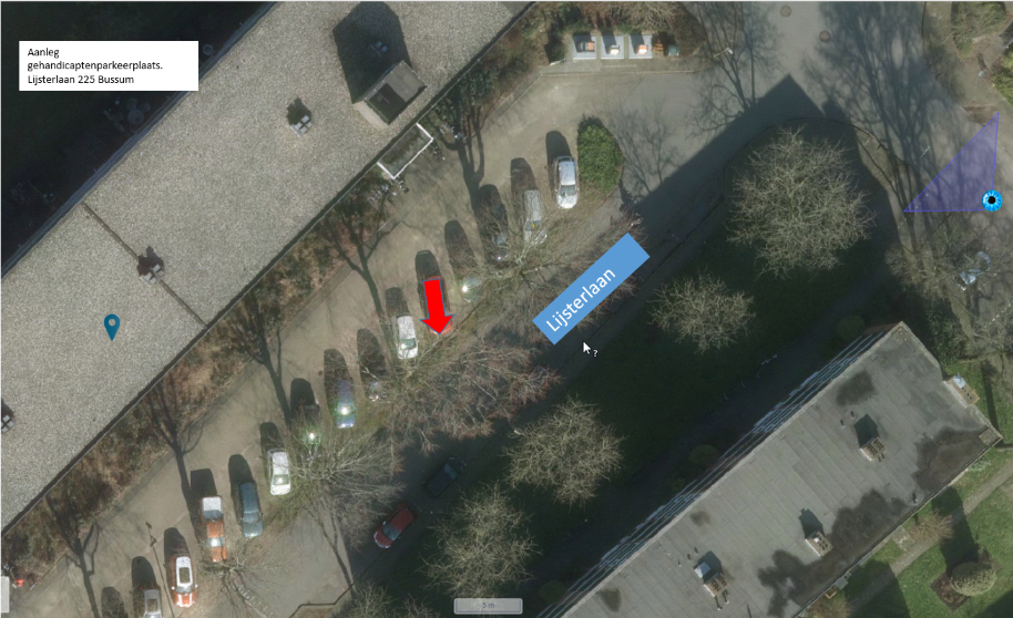 De gemeente Gooise Meren heeft naar aanleiding van een verzoek van een bewoner besloten om met behulp van een kenteken een gehandicaptenparkeerplaats voor de bewoner te reserveren ter hoogte van de woning met het adres Lijsterlaan 225, 1403AV Bussum. Op de situatietekening staat de beoogde locatie van de te reserveren parkeerplaats weergegeven.
