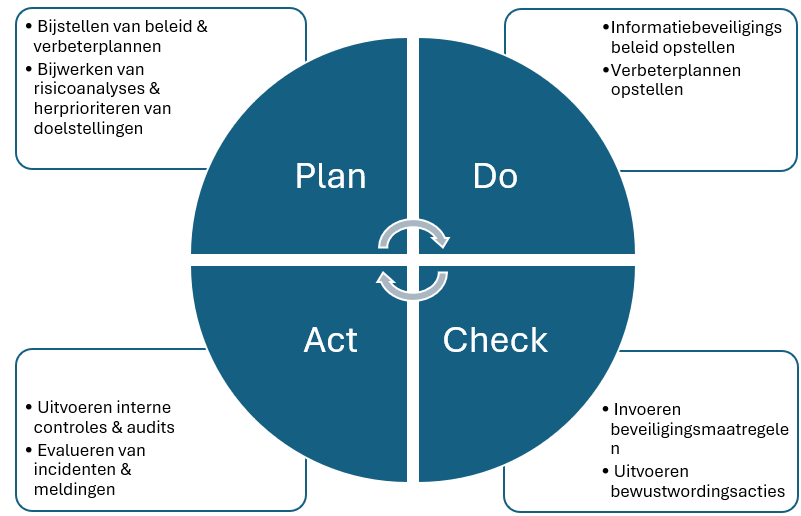 Om de borging van het informatiebeveiligingsbeleid en de daarvan afgeleide plannen te realiseren wordt onderstaande Plan, Do, Check, Act (PDCA)-cyclus doorlopen (afbeelding 1). De volgende uitgangspunten worden gehanteerd voor het doorlopen van de PDCA-cyclus (Information Security Management System (ISMS)).