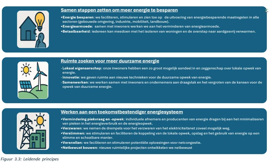 Als onderdeel van de strategie hanteren we een aantal leidende principes. Deze kunnen als richtsnoeren gezien worden voor de ontwikkeling van het energiesysteem in 2050. Deze doen recht aan de identiteit van Zwartewaterland en bieden handelingsperspectief bij het maken van toekomstige keuzes. De leidende principes zijn in de volgende figuur weergegeven.