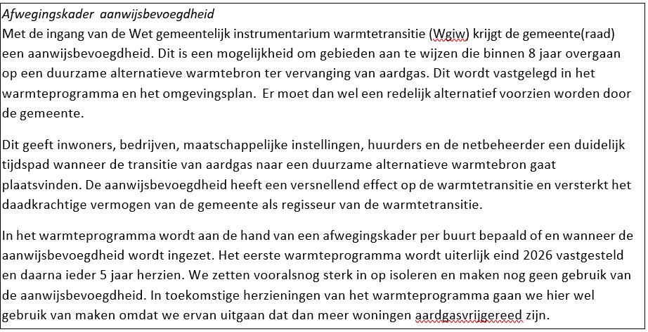 Dat wil niet zeggen dat er geen panden aardgasvrij worden gemaakt; dat verloopt in een natuurlijk tempo en is mede afhankelijk van de buurtaanpak van Enexis. Na 2040 zetten we ons in voor een versnelde groei van het aantal aardgasvrije woningen en gebouwen en kunnen we ook de aanwijsbevoegdheid gebruiken.