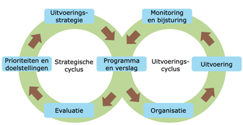 De linker regelkring betreft beleidskeuzen, strategie, het opstellen van een uitvoeringsprogramma en beleidsevaluatie. De rechter regelkring betreft het uitvoeringsprogramma en de professionele werkwijze, uitvoering en monitoring.