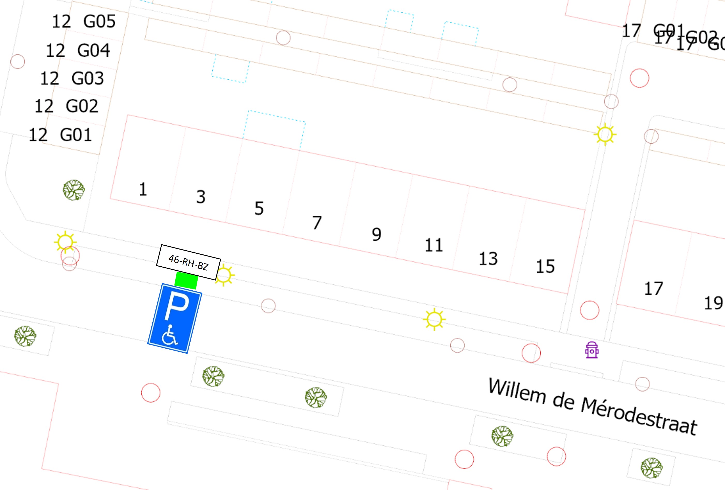 Het aanwijzen en inrichten van een gehandicaptenparkeerplaats op kenteken aan de Willem de Mérodestraat, ter hoogte van perceelnummer 3, door het plaatsen van het verkeersbord E6 van het RVV 1990 met onderbord met kenteken 46-RH-BZ, zoals is aangegeven op de overzichtstekening in dit besluit.