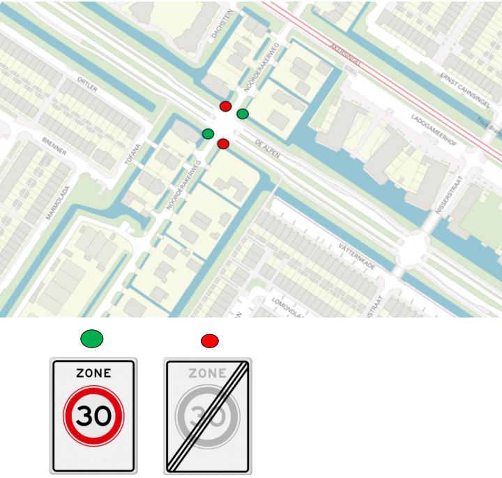 Door het plaatsen van verkeersborden conform model A1-30 (begin- en einde zone)uit bijlage 1 van het RVV1990 in te stellen: Een maximumsnelheid van 30 km/uur op de twee doodlopende delen van de Noorderakerweg welke gelegen zijn aan weerszijden van De Alpen.