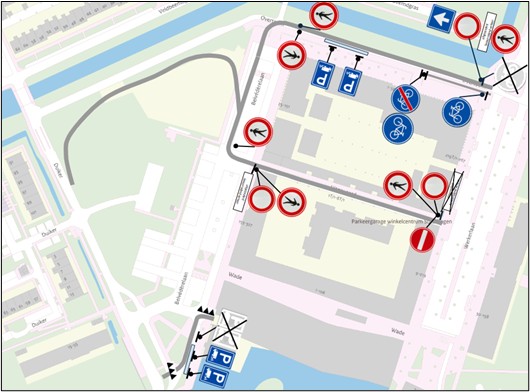 dat de bestaande ontsluiting van de Belvédèrelaan tussen de Wade en de Duiker wordt opgeheven en naast het bestaande verplicht fietspad een tijdelijke ontsluitingsweg van en naar de parkeergarage aan de Wade en vanaf het bouwterrein wordt aangelegd;