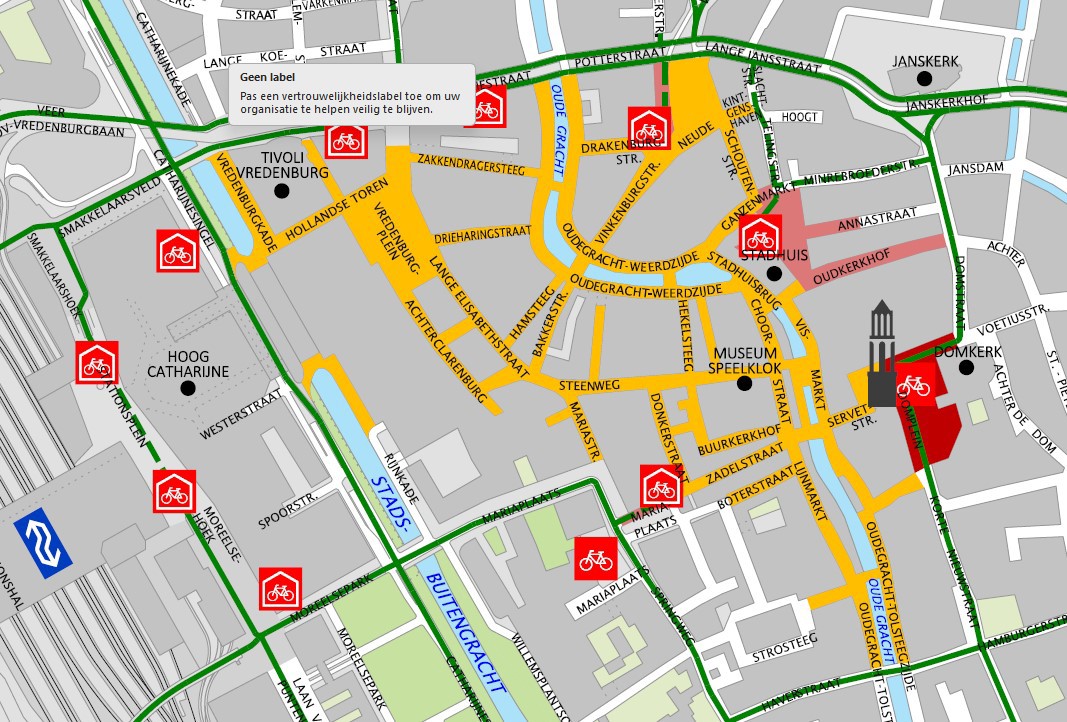 - De hele buitengrens van het voetgangersgebied wordt met het bord G7 zone met op het onderbord de aangepaste venstertijden, aangegeven. Daar waar in verband met de fietsenstallingen nog binnengrenzen zijn (straks alleen nog maar op de Neude nabij de bibliotheek) wordt het bord G7 herhaald.