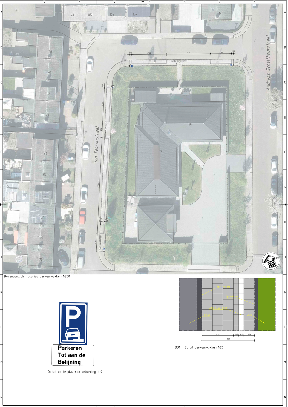 - de maatregel te markeren met witte tegels en te voorzien van de borden E04B RVV, met onderbord “parkeren tot aan de belijning”.