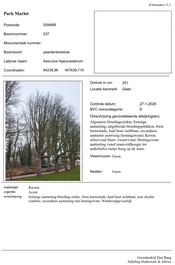 Op 27 januari 2026 is door afdeling Onderzoek en Advies geconstateerd dat de Paardenkastanje (Aesculus hippocastanum), met stamomtrek van 251 cm en boomnummer 237 op landgoed Marlot vanwege ernstige aantasting door kastanjebloedingsziekte windworpgevaarlijk is en dat acute kap noodzakelijk is om de veiligheid te waarborgen.