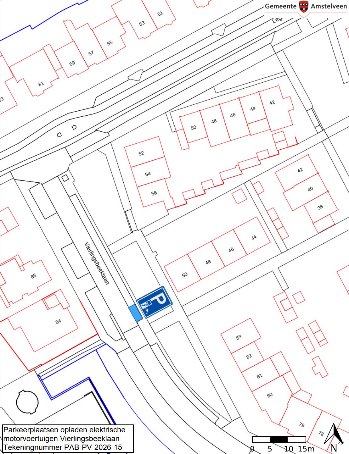 Burgemeester en wethouders van Amstelveen besluiten om in de Vierlingsbeeklaan één parkeerplaats aan te wijzen als parkeerplaats voor het opladen van elektrische motorvoertuigen. De parkeerplaats mag alleen gebruikt worden voor het opladen van deze elektrische motorvoertuigen.