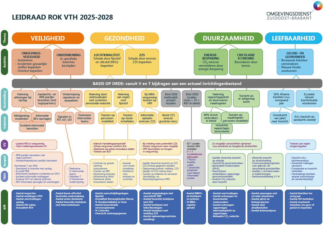 Voor de uitvoering van toezicht en handhaving bij industriële en agrarische bedrijven werken we volgens de ROK-systematiek. Het ROK-VTH vormt voor de ODZOB het kader waarbinnen we onze werkzaamheden de komende 4 jaar gaan uitvoeren. In het ROK-VTH zijn zowel inhoudelijke doelstellingen als ambities en randvoorwaarden voor continue kwaliteitsontwikkeling (ontwikkelopgaven) opgenomen. In lijn daarmee is, in de vorm van een doelenboom, met onze deelnemende gemeenten de Leidraad ROK VTH 2025-2028 opgesteld. In deze leidraad is meer duiding gegeven aan de bestuurlijke ambities en doelstellingen binnen het VTH-domein. De doelenboom is opgenomen in bijlage 1.