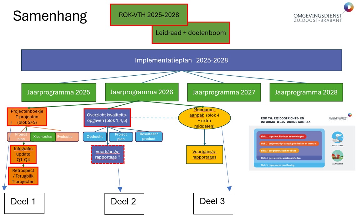 Om grip te krijgen en te houden op de uitvoering van alle activiteiten onder het ROK-VTH en zeker ook gezien de omvang van het programma is een implementatieplan gemaakt. Dit gebruiken we om zowel de onderliggende ontwikkelopgaven als ook acties/projecten voor de inhoudelijke doelstellingen te plannen over een periode van 4 jaar (2025-2028). Dit implementatieplan is in het voorjaar 2025 met de deelnemers gedeeld. In bijlage 2 wordt verder ingegaan op dit implementatieplan (A) en het jaarprogramma 2026 (B).