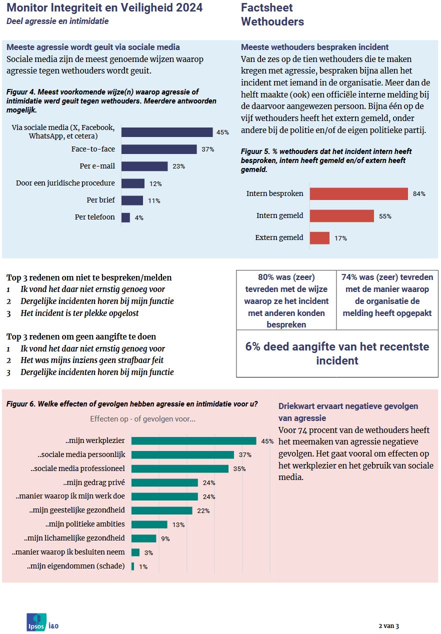 Politieke ambtsdragers kunnen contact opnemen met het Instituut voor Psychotrauma (IVP). Het IVP biedt acute gespecialiseerde psychosociale ondersteuning, waarop dag en nacht beroep kan worden gedaan door politieke ambtsdragers, die te maken hebben gehad met agressie, geweld en bedreigingen. Het alarmnummer/meldpunt van Instituut voor Psychotrauma kan worden ingeschakeld via 020-8407620 en buiten kantoortijden via 088-3305112.