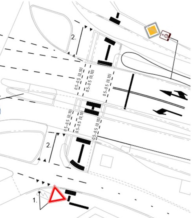 Te plaatsen bord B6 (verleen voorrang aan bestuurders op de kruisende weg) van bijlage 1 van het RVV 1990, op de locatie onder markering 1. op de volgende tekening.