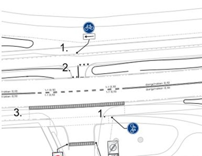 Te plaatsen borden G11 van bijlage 1 van het RVV 1990 (verplicht fietspad) op de locaties onder markeringen 4. op de volgende afbeelding.