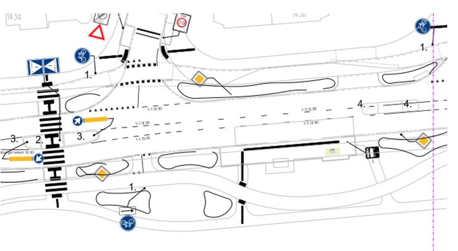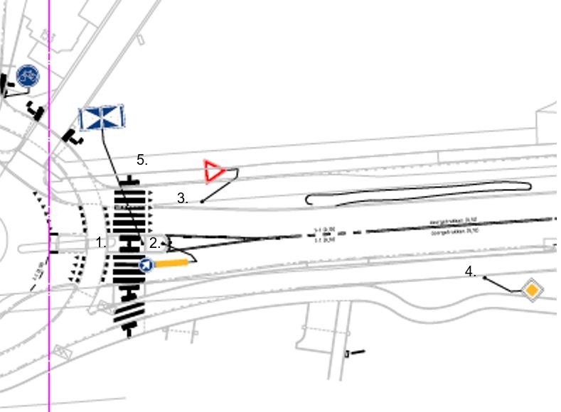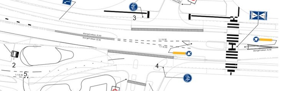 Verwijderen markeringen voetgangersoversteekplaats (zebrapad) geplaatst op de locaties onder de markeringen 5. op de volgende afbeelding (markering niet op tekening).