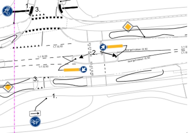 Te plaatsen borden D1 (Rotonde, verplichte rijrichting) op de locaties onder markering 2. op de volgende afbeelding.
