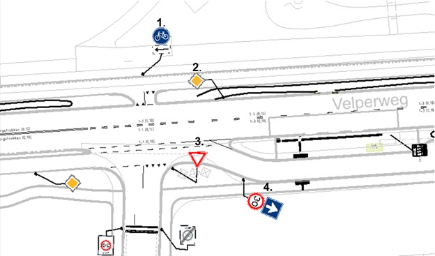 Te plaatsen bord B1 van bijlage 1 van het RVV 1990 (voorrangsweg) op de locatie onder markering 3. op de volgende afbeelding.