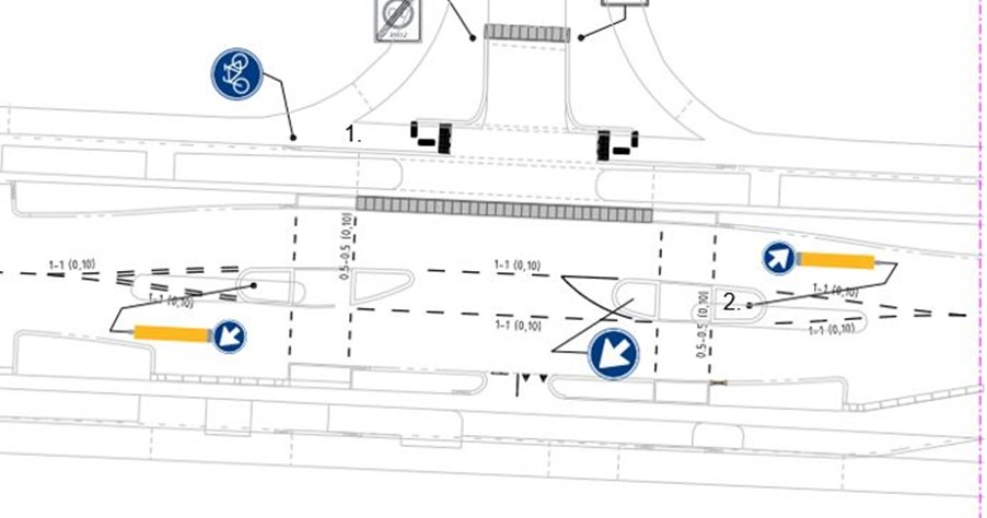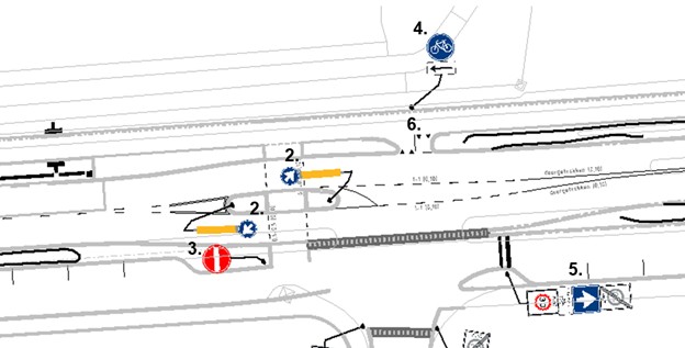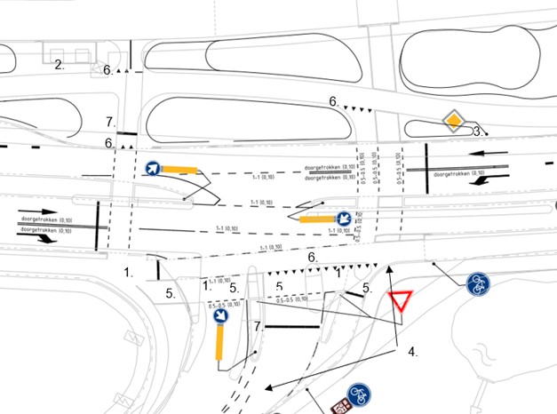 Verwijderen bord G11 (verplicht fietspad) van bijlage 1 van het RVV 1990 op de locatie onder markeringen 6. op de volgende afbeelding (bord niet aangegeven op tekening).