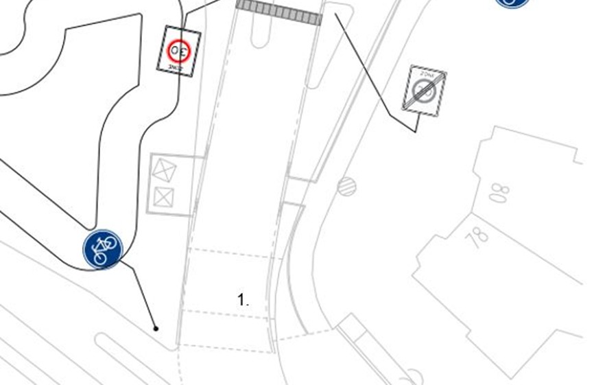 Te plaatsen bord G11 (verplicht fietspad) van bijlage 1 van het RVV 1990 op de locatie onder markering 1. op de volgende tekening.
