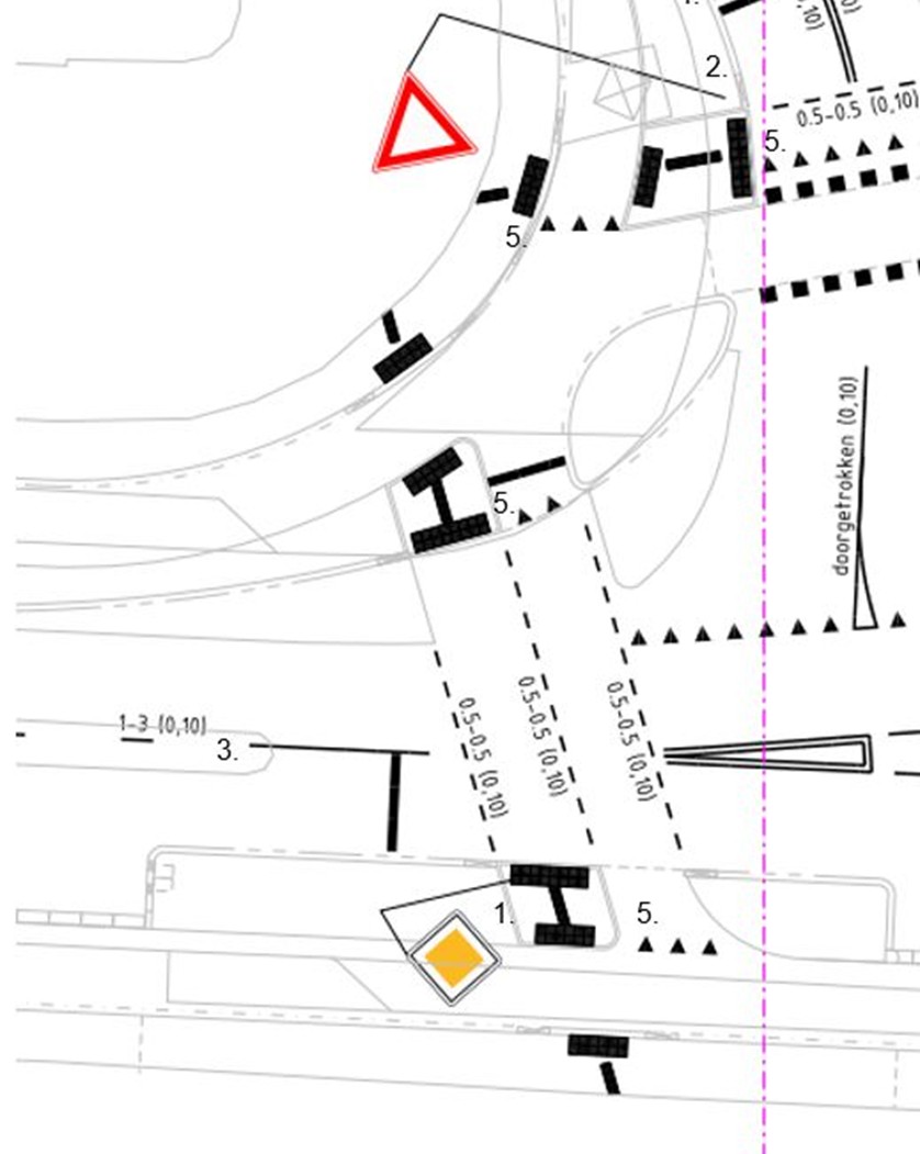 Haaientanden aan te brengen als bedoeld in artikel 80 RVV 1990 op de locatie onder markering 5. op de volgende tekening.