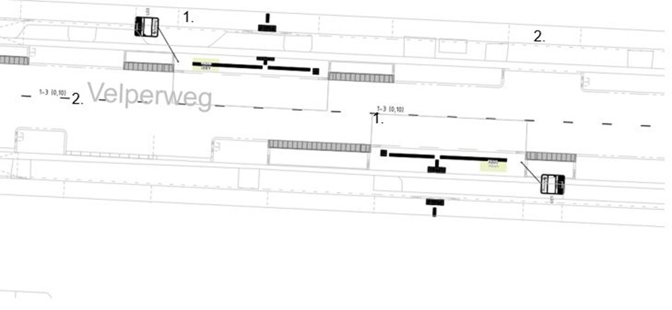 Te plaatsen borden overeenkomstig model L3 (bushalte) van bijlage 1 van het RVV 1990 en het aanbrengen van blokmarkering als bedoeld in artikel 23, eerste lid, onderdeel e, van het RVV 1990 aan beide zijden van de Velperweg in Arnhem, ter hoogte van de nummers 113 en 134, op de locaties onder markeringen 1. op de volgende afbeelding.
