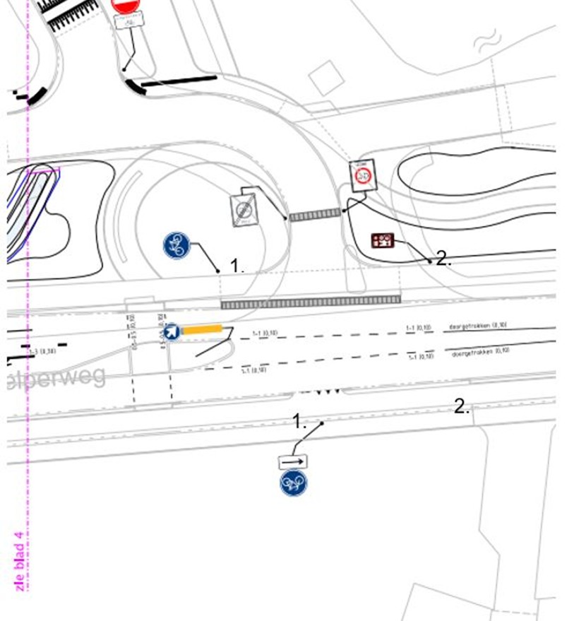 Te verwijderen borden D2 van bijlage 1 van het RVV 1990 op de locaties onder markeringen 4. op de volgende afbeelding (borden niet op tekening).