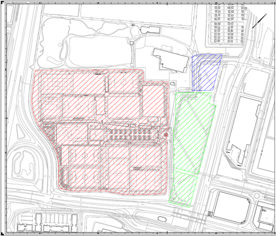 Op bovenstaande afbeelding zijn het in erfpacht uit te geven perceel (groen), de kop van P2 waarvoor Ajax N.V. een eerste erfpachtoptie heeft (blauw) en De Toekomst in de huidige situatie (rood) weergegeven.