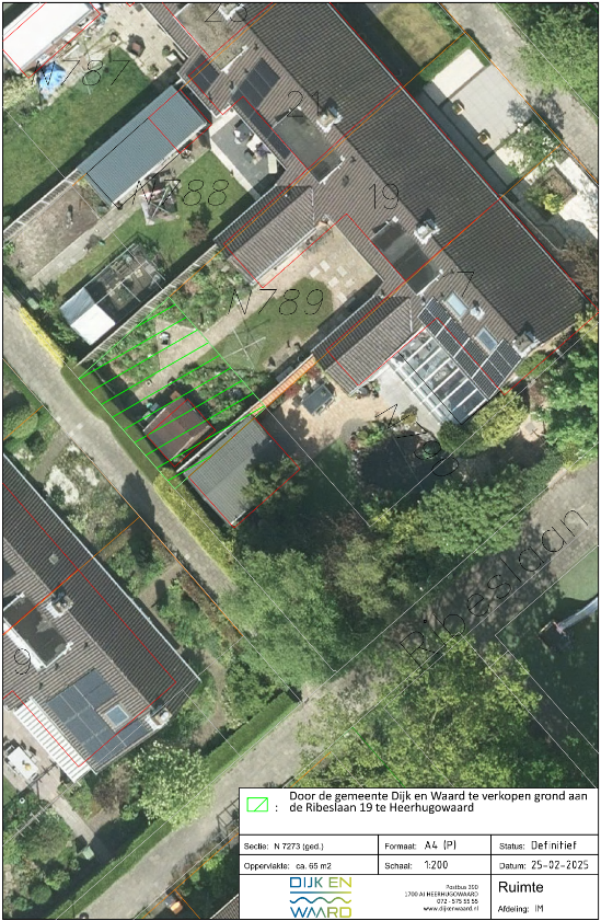 De gemeente Dijk en Waard is voor een tuinuitbreiding van plan om snippergroen kadastraal bekend als Heerhugowaard, sectie N, nummer 7273 (gedeeltelijk) ter grootte van ca. 65 vierkante meter te verkopen aan de eigenaar van de aangrenzende woning aan Ribeslaan 19, 1702LP Heerhugowaard.