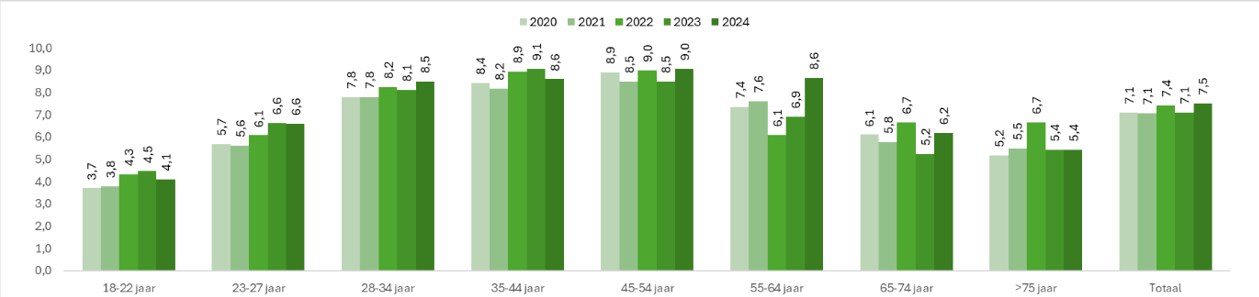 Figuur 2-4 Overzicht inschrijftijd per leeftijdsgroep van 2020-2024. Bron: Trendmonitor Woonruimteverdeling Woonservice, 2024