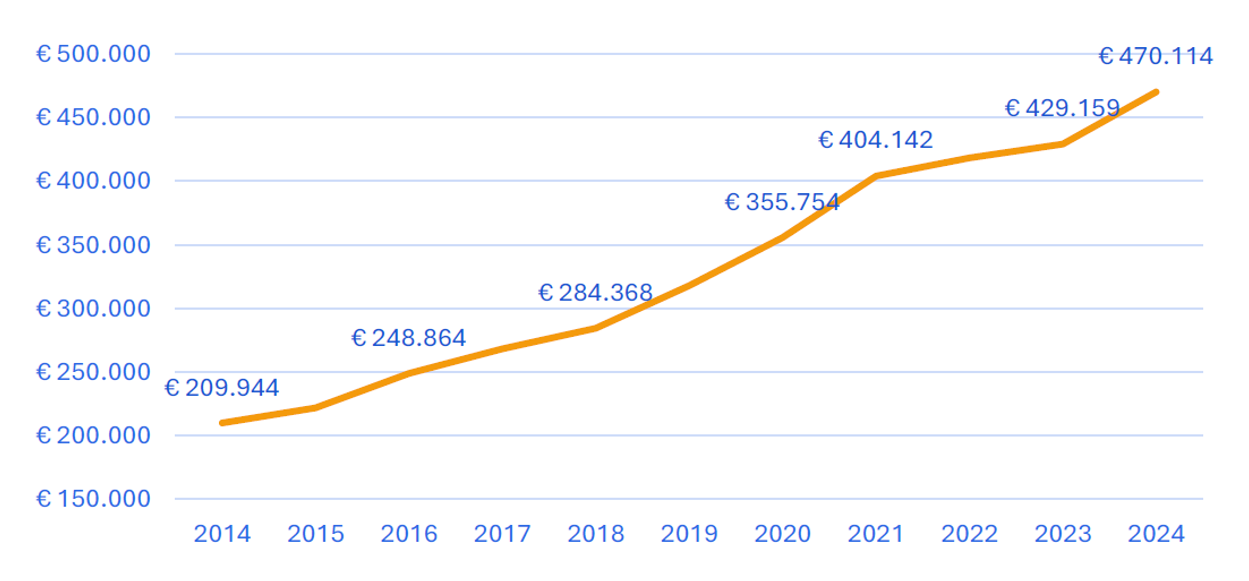 Prijsontwikkeling is een andere indicator voor krapte. Gedurende de gehele periode van 2014 tot 2024 is er een stijgende trend in de transactieprijzen te zien. In Beverwijk steeg de prijs met 128% en in Heemskerk met 124%. De gemiddelde transactieprijs in Heemskerk is in 2024 met €470.114,- beduidend hogere dan de betaalbare koopgrens van dat jaar (€ 390.000,-).