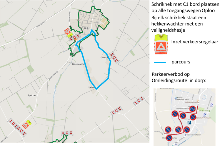 Het instellen van een parkeerverbod op de omleidingsroute in het dorp op de Deken Schemerlingstraat, Boortorenstraat en Gildestraat te Oploo middels bebording te plaatsen van bijlage 1 van het Reglement Verkeersregels en Verkeerstekens 1990 volgens model E1 op 29 maart 2026 van 08:00 uur tot 17:00 uur.