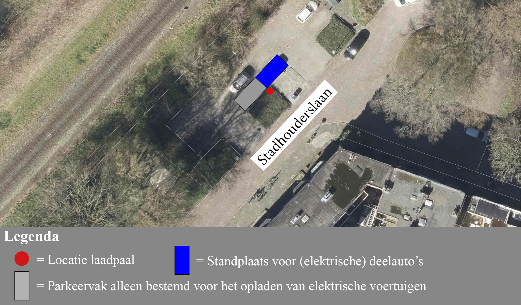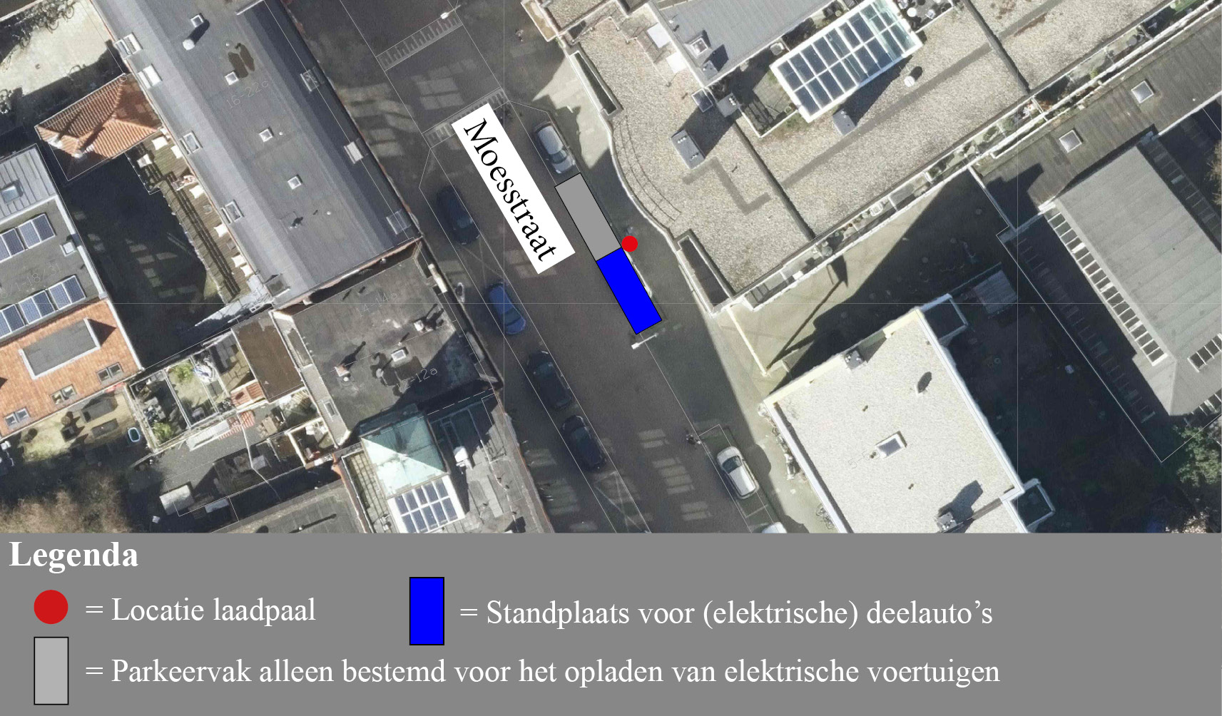 Om te zorgen dat één van de twee al eerder aangewezen parkeervakken alleen voor opladen elektrische voertuigen bij de laadpaal gebruikt kan worden door een deelauto, wordt de bestaande bebording verwijderd en bij één parkeervak bord E8 met daarop de tekst ‘autodelen’ (bordnummer E8r) met onderbord met de tekst ‘alleen voor’ en het logo van de betreffende deelauto-exploitant geplaatst. Bij het overgebleven parkeervak alleen voor opladen elektrische voertuigen, wordt bord E8c (parkeergelegenheid alleen bestemd voor het opladen van elektrische voertuigen) geplaatst. Dat parkeervak blijft openbaar, maar mag alleen gebruikt worden voor het opladen van elektrische voertuigen.