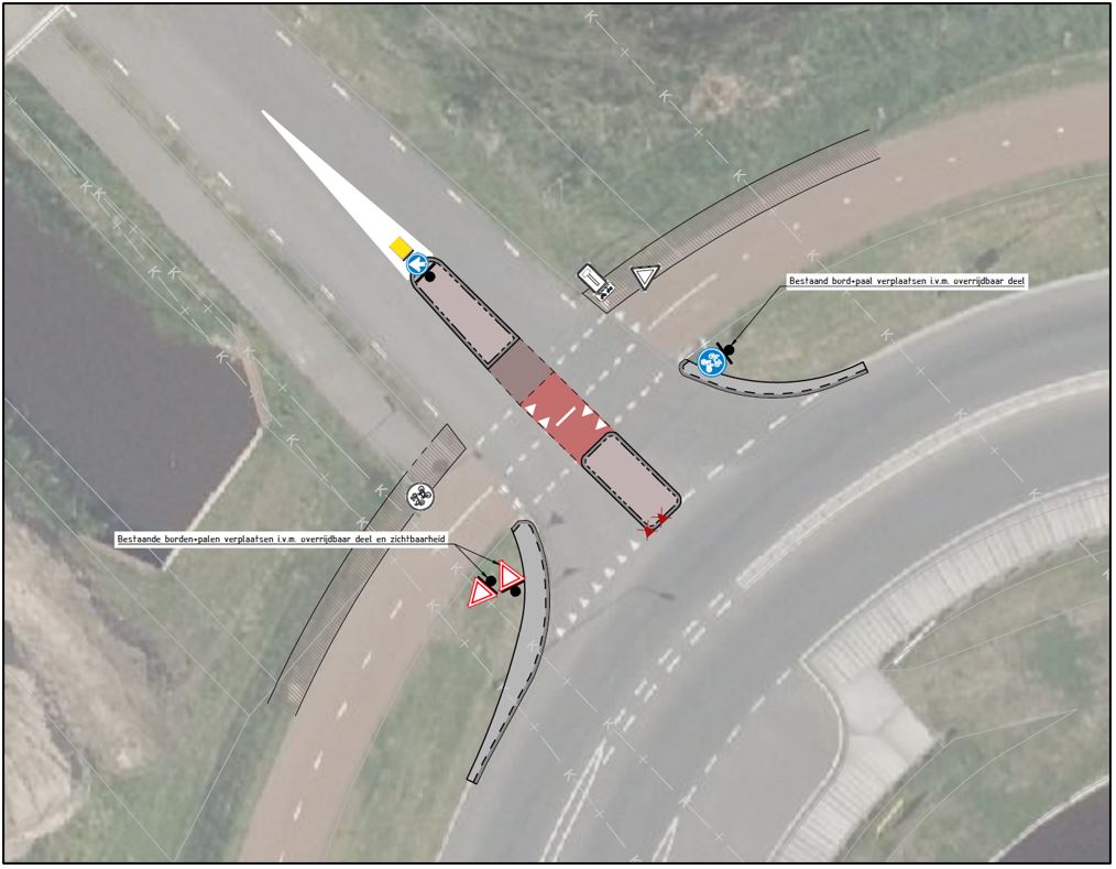 Om een veilige oversteek over de Hoofdweg te faciliteren is overwogen dat het realiseren van een middengeleider wenselijk is. Op die wijze kunnen voetgangers en fietsers in twee fasen oversteken. Het is in dat kader van belang om door middel van het plaatsen van verkeersbord D2 van bijlage 1 van het RVV 1990 geboden in te stellen het middengeleider aan de rechterzijde te passeren. Daarmee wordt de verkeersveiligheid ter hoogte van de oversteek zo veel mogelijk gewaarborgd.