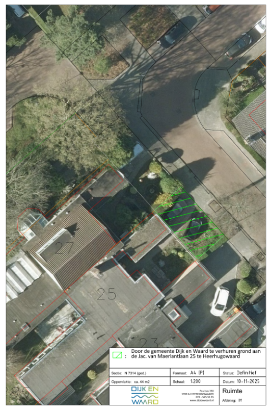 De gemeente Dijk en Waard is voor een tuinuitbreiding van plan om snippergroen kadastraal bekend als Heerhugowaard, sectie N, nummer 7314 (gedeeltelijk) ter grootte van ca. 44 vierkante meter te verhuren aan de eigenaar van de aangrenzende woning aan Jac. van Maerlantlaan 25, 1702GL Heerhugowaard.