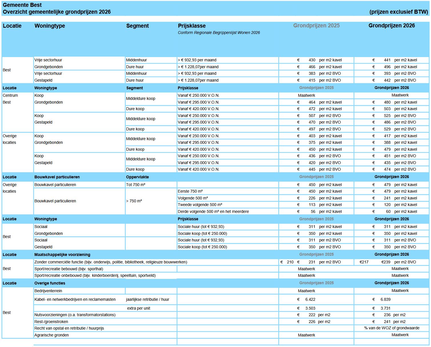 Bijlage Overzicht gemeentelijke grondprijzen 2026
