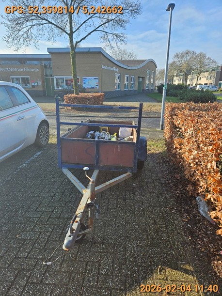 Aan de Walt Dinseyplantsoen te Almere staat een houten aanhangwagen met donkerblauwe accenten. De aanhangwagen geplaatst in strijd met het bepaalde in artikel 5:4 van de Algemene Plaatselijke Verordening (APV 2011. Op grond van artikel 5:4 eerste lid van de APV 2011 is het verboden een voertuig dat rij technisch in onvoldoende staat van onderhoud of tevens in een kennelijk verwaarloosde toestand verkeert op de weg of op een parkeergelegenheid te plaatsen of te parkeren.
