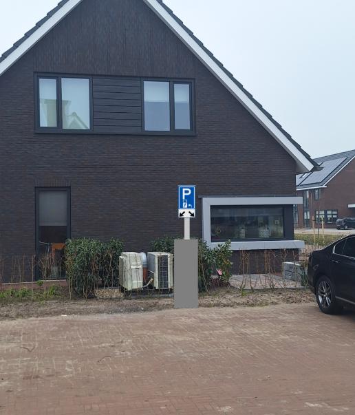 In het midden van beide gereserveerde parkeervakken worden de laadpaal en het verkeersbord E8C en onderbord OB504 geplaatst.