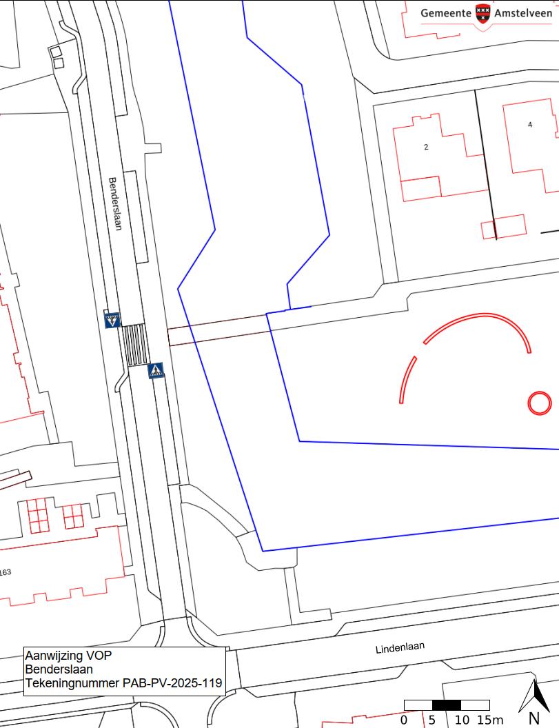 Burgemeester en wethouders van Amstelveen besluiten om een voetgangersoversteekplaats aan te leggen op het verkeersplateau op de Benderslaan zoals te zien is in tekening: PAB-PV-2025-119