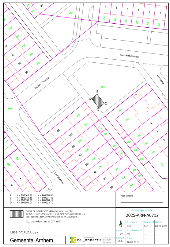 Liander N.V. is voornemens om nabij de Leenspad, kadastraal bekend gemeente Arnhem, sectie W nummer 2109 gedeeltelijk, een middenspanningsruimte (hierna: MSR) te realiseren ten behoeve van de stroomvoorziening van het omliggende gebied. De MSR dient te worden gerealiseerd op een gedeelte van de locatie zoals aangegeven op bijgaande tekening met nummer 2025-ARN-A0713 (002). Liander heeft om deze reden verzocht tot vestiging van een opstalrecht op deze locatie (circa 27 m2) ten behoeve van Liander.