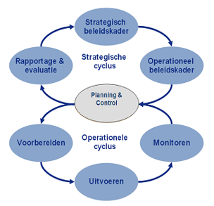 Het ‘blijven ontwikkelen’ wordt voor een belangrijk deel gevoed vanuit de beleidscyclus (Big-8 of Big Eight). Om een effectieve en lerende organisatie te zijn, is het noodzakelijk regelmatig de gang van zaken tegen het licht te houden. Op deze wijze is het mogelijk te zien of beleid en uitvoering doelmatig en doeltreffend zijn. De beleidscyclus geeft de relatie tussen het maken van beleid en het evalueren ervan in de loop van de tijd weer. De Big-8 cyclus, opgenomen in figuur 1, maakt het proces van beleid maken, programmeren, uitvoeren en evalueren inzichtelijk en ook de verbinding tussen beleid en uitvoering. In deze paragraaf wordt op enkele van deze punten verder ingegaan.