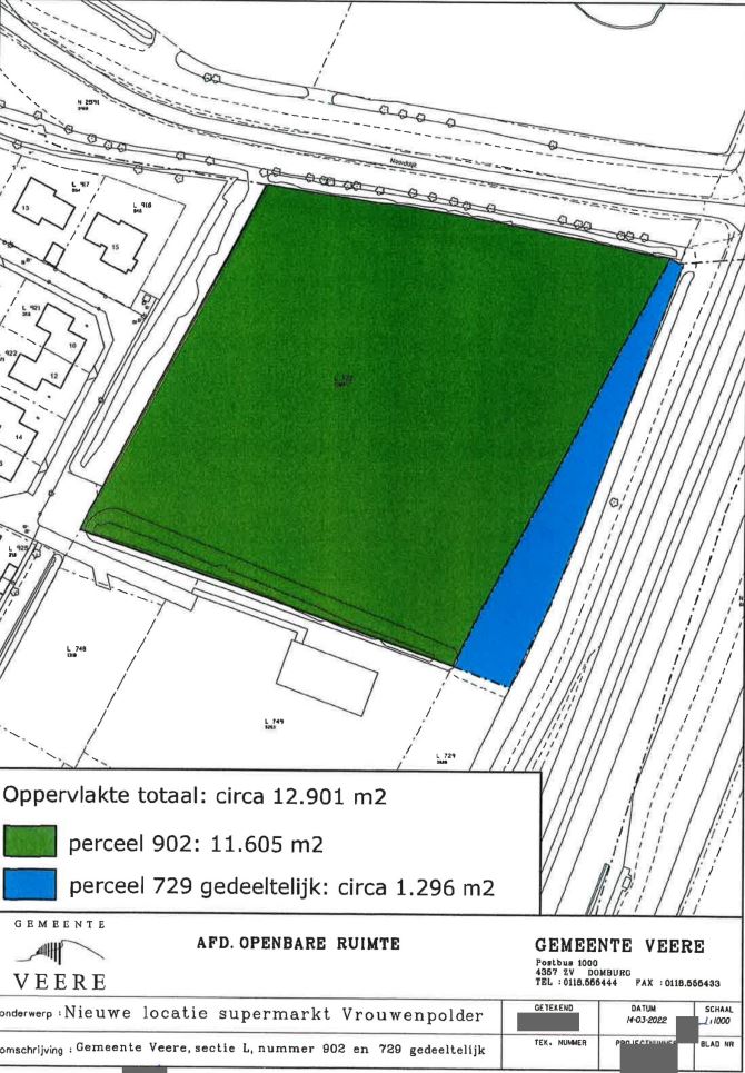 De Gemeente Veere heeft het voornemen om een perceel grond, gelegen aan de Parallelweg N57 West te Vrouwenpolder, gemeente Veere, uitmakende een gedeelte ter grootte van ongeveer 1.296 m² van het perceel kadastraal bekend gemeente Veere, sectie L nummer 729 dat schetsmatig met een blauwe kleur is weergegeven op onderstaande tekening te verkopen en te leveren aan de beoogd koper ten behoeve van het aanleggen van een ontsluitingsweg voor de te realiseren supermarkt.