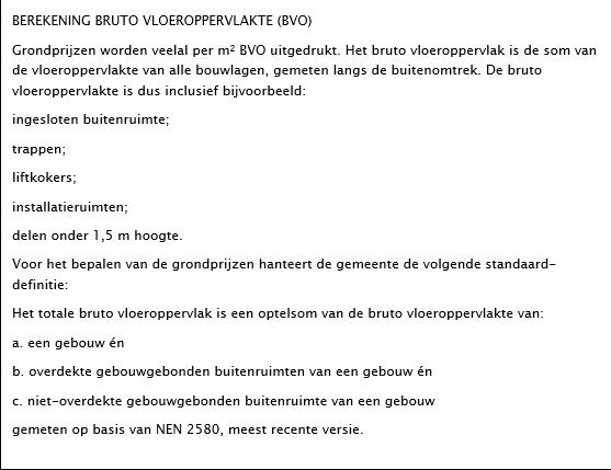 De gemeente rekent voor gronden met maatschappelijke functies met winstoogmerk een vaste grondprijs van € 260,- per m2 bvo. Voorbeelden van maatschappelijke functies met winstoogmerk zijn o.a. praktijkruimtes voor medische beroepen zoals een tandarts of fysiotherapeut, kinderdagverblijven, etc. Voor zorgwoningen geldt dit uitgangspunt niet, dan wordt de grondprijs residueel bepaald. De gronden worden uitgeven in erfpacht. De vermelde prijs geldt als prijs per m2 terrein, tenzij het aantal m2 bvo groter is dan het aantal m2 terrein. Dan geldt de vermelde prijs als prijs per m2 bvo.