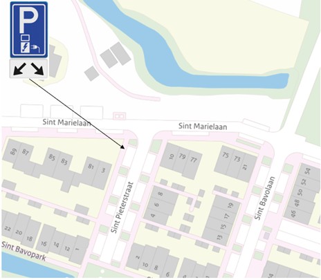- dit bereikt kan worden door het plaatsen van verkeersbord E08c uit Bijlage 1 van het RVV 1990 met het onderbord OB504 (twee (2) pijlen ter aanduiding waar elektrische voertuigen opgeladen kunnen worden);