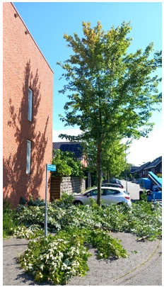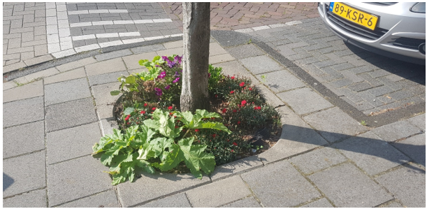 Bomen die in een stoep of straat staan of daarin geplant gaan worden, moeten een goede groeiplaats krijgen. Een gemiddelde boom vraagt ondergronds om een ruimte van wel twee parkeerplaatsen om goed te kunnen wortelen. En voor een goede uitwisseling van water en zuurstof is een grote boomspiegel nodig. (zie figuur 2, drie bomen met onderbeplanting) Dit type inrichting vergroot de wateropname en waterbuffering van de bodem. De beplante boomspiegel biedt daarnaast schuilplekken aan egels en vogels. In het dagelijks beheer zorgt de gemeente ervoor bladeren die zijn afgevallen rondom de boomspiegel blijven liggen. Dit bevordert de voedselkringloop en er hoeft minder blad weggebracht te worden.