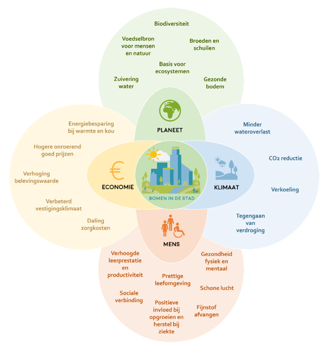 Uit onderzoek blijkt dat vooral bomen, aanzienlijk kunnen bijdragen aan een beter stedelijk klimaat. Daarnaast leveren bomen ‘ecosysteemdiensten’. Ecosysteemdiensten zijn de voordelen die plantsoenen en bomen ons mensen en maatschappij geven. Daarin onderscheiden we vier categorieën: planeet, klimaat, mens en economie. In elke categorie leveren bomen grote voordelen. Zij dragen bij aan een fijnere leefomgeving en daarmee voelen we ons prettiger en gezonder.