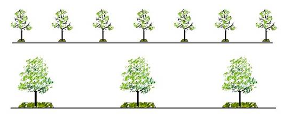 Veel kleine bomen nemen ruimte in en vragen doorlopend onderhoud. Denk maar eens aan het opdrukken van verharding door boomwortels door de gebrekkige ruimte voor de boom om te wortelen. Zo’n situatie kan verbeteren door het rooien van twee slecht groeiende bomen en een derde boom te behouden, deze wordt dan voorzien van een ruime groeiplaats die ook met laagblijvende struiken of vasteplanten beplant kan worden.
