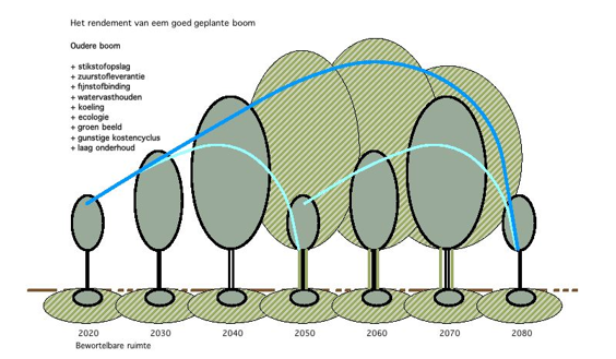 In onderstaande figuur (3) is een boom afgebeeld die 60 jaar oud wordt en in die tijd veel groter is geworden dan een vergelijkbare boom die in dezelfde tijd een keer vervangen is. Door deze twee patronen tegen elkaar af te zetten, wordt het duidelijk dat de boom veel meer ecosysteemdiensten kan leveren als deze de tijd krijgt om goed door te groeien. De investeringskosten verdelen we over veel meer jaren.