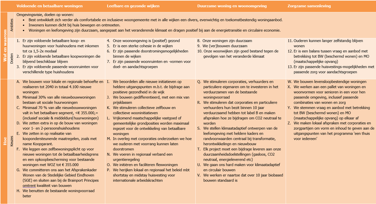Naast de Omgevingsvisie vormt het raadsbrede beleidsakkoord 2022-2026 ‘we doen het samen’ het belangrijkste kader voor het woonbeleid Best 2024-2028 (volkshuisvestingsprogramma) . Hierin heeft de raad haar speerpunten op wonen voor de lopende raadsperiode aangegeven. Ze benoemen zowel de kwantitatieve opgave (4.100 woningen tot 2040) als kwalitatieve opgave. Dit betekent bevorderen doorstroming, aandacht voor passende woningen en woonvormen van combinaties van wonen en zorg, verduurzaming bestaande woningvoorraad en bevorderen van leefbaarheid, zorg voor voldoende, blijvend betaalbare woningen en meer woningen voor kleine huishoudens.