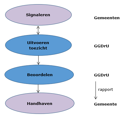 Met de deelnemende gemeenten is afgesproken dat de gemeenten met elkaar afstemmen wie welke handhavingsstappen zet. Hierbij is de opdrachtgevende gemeente met het grootste aantal indicaties leidend. GGDrU kan worden benaderd indien deze informatie niet bekend is bij de initiatief nemende gemeente. Hierin is het van belang bekend te zijn met de verschillen in de relatie met de aanbieder (subsidierelatie of contractrelatie). Dat brengt verschillen met zich mee in de aanpak.